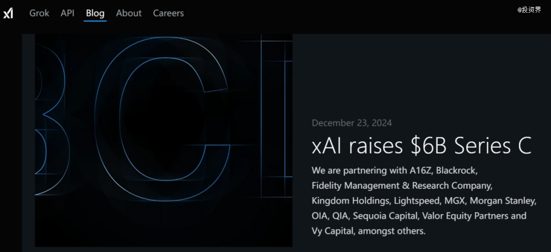 在xAI公開的兩次融資,金額和陣容都令業(yè)界震驚。今年5月,xAI宣布完成史上最大的一筆B輪融資,金額達到60億美元(420億人民幣),主要投資方包括特斯拉和SpaceX的首批投資機構Valor Equity Partners、迪拜的“神秘”投資公司Vy Capital、硅谷風險投資公司Andreessen Horowitz、紅杉資本(Sequoia Capital)、沙特王國控股公司Kingdom Holding等。完成融資后,xAI的估值達到240億美元(1680億人民幣)。