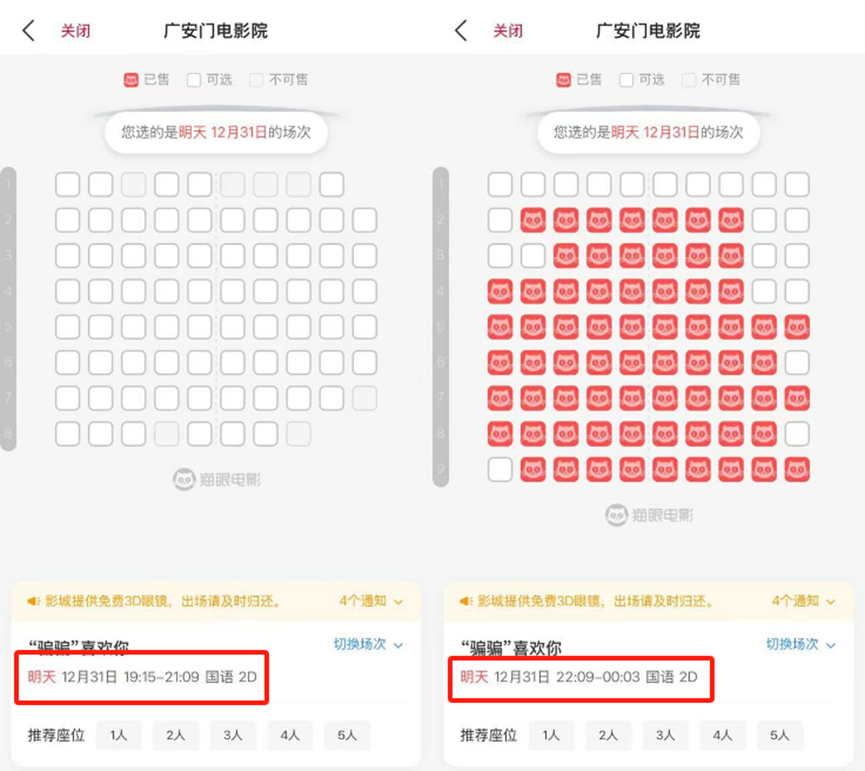 當(dāng)然,作為這個(gè)檔期唯一的愛情片,《“騙騙”》還是保留了特殊場——12月31日即上映首日的零點(diǎn)場為煙花跨年場。「定焦One」對比了北京豐臺、朝陽、海淀等區(qū)的多家影院發(fā)現(xiàn),上映當(dāng)日,22點(diǎn)“跨年場”的售票情況要遠(yuǎn)遠(yuǎn)優(yōu)于當(dāng)日其他場次。