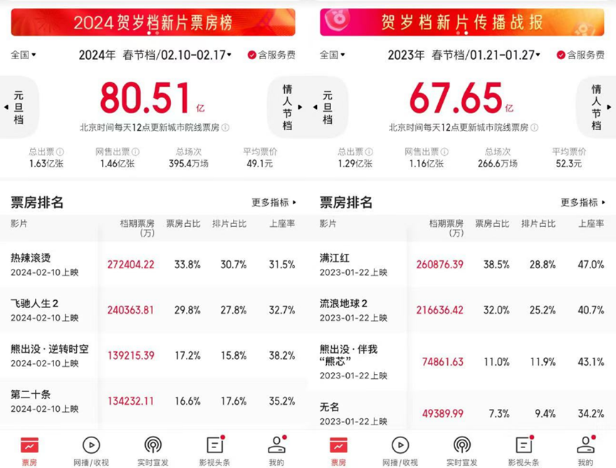 2024年上半年的票房表現(xiàn)其實(shí)不差,春節(jié)檔以80.5億收官,比2023年(67.65億)多出了將近13億。五一檔的表現(xiàn)也基本與上一年持平,只可惜暑期檔、端午檔的連續(xù)失手,拉低了全年票房表現(xiàn)。