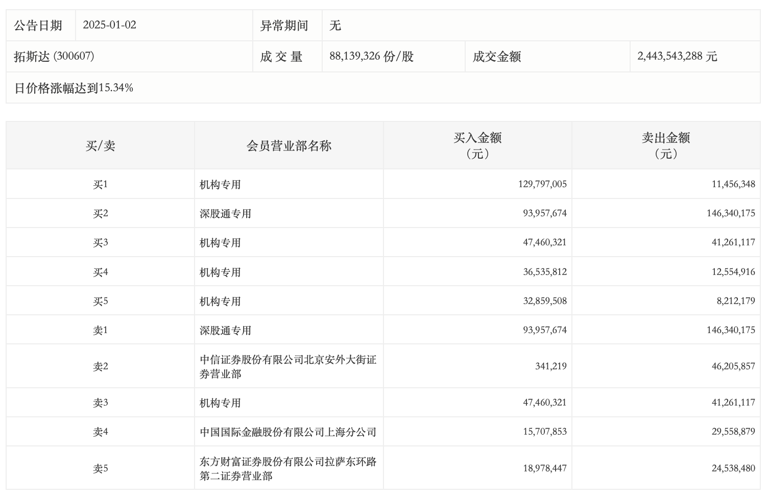 1月2日,拓斯達(dá)今日漲15.34%,成交額24.44億元,換手率26.10%,盤后龍虎榜數(shù)據(jù)顯示,深股通專用席位買入9395.77萬元并賣出1.46億元,4家機構(gòu)專用席位凈買入1.73億元。