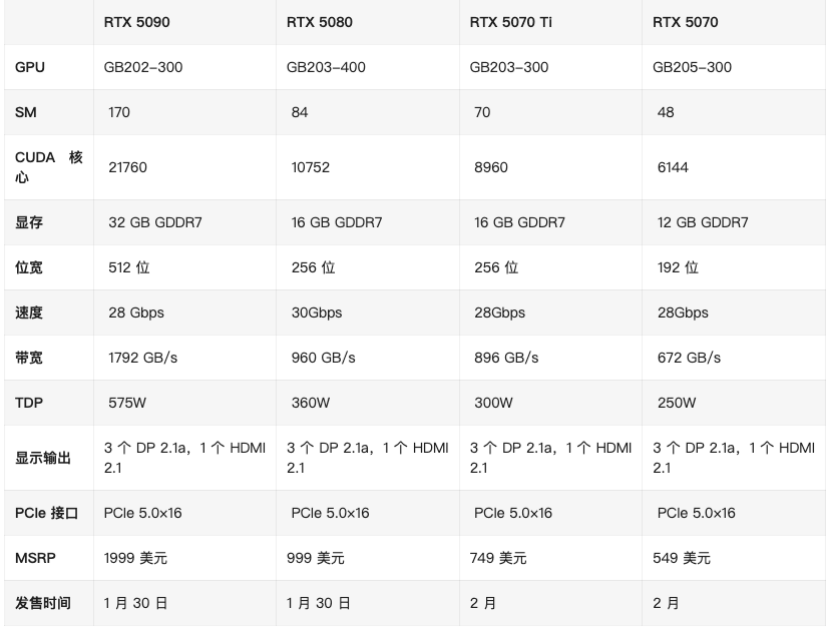 價(jià)格分別為:RTX 5090售價(jià)1999美元、RTX 5080 售價(jià)999美元、RTX 5070 Ti售價(jià)749美元,RTX 5070售價(jià)549美元。其中,RTX 5080將于1月21日率先上市。RTX 5090D(國(guó)內(nèi)特供版)售價(jià)16499元起,RTX 5080售價(jià)8299元起。