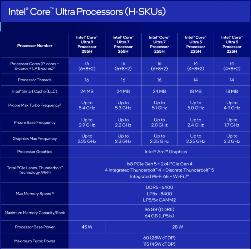 對(duì)于這些高速筆記本電腦,英特爾酷睿超 200H 系列是游戲的代名詞。該系列從酷睿超 5 225H 處理器開(kāi)始,該處理器包含四個(gè) P 核(最高 4.9GHz)、八個(gè) E 核、兩個(gè) LPE 核和八個(gè) Xe 圖形核心(最高 2.2GHz)。最后是功能強(qiáng)大的酷睿超 9 285H,該處理器包含六個(gè) P 核(最高 5.4GHz)、八個(gè) E 核、兩個(gè) LPE 核和八個(gè) Xe 核(最高 2.35GHz),可用于高強(qiáng)度工作或游戲。