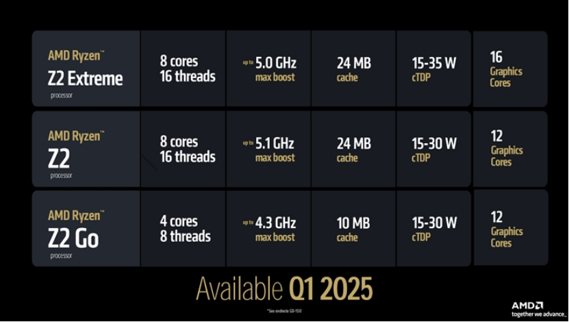 有四核 Ryzen Z2 Go(最高主頻 4.3GHz)和 12 個(gè)顯卡核心,還有八核 Ryzen Z2 Extreme(最高主頻 5Ghz)和 16 個(gè)顯卡核心。它們加入了八核 Ryzen Z2,后者最高主頻 5.1GHz,并配備 12 個(gè)顯卡核心。所有三款 Ryzen Z2 SKU 將于 2025 年第一季度上市。