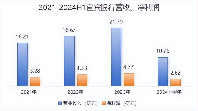 近幾年宜賓銀行的業(yè)績表現(xiàn)良好,營收及凈利潤均保持一定增長趨勢。其中2024年上半年凈利潤為2.62億元,同比增長2.87%。