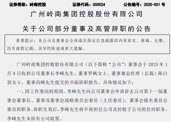 2024年3月,李云履新首旅酒店董事長,原董事長白凡因工作變動辭職;2024年6月,錦江酒店沈莉因年齡原因辭去首席執(zhí)行官職務(wù),聘任毛嘯接任;2024年10月,西安旅游總經(jīng)理莊瑩因工作變動辭職。2024年12月,西安旅游董事長王偉同樣因?yàn)楣ぷ髟蜣o職;今年1月,嶺南控股董事長李峰、董事羅楓、董事兼總經(jīng)理(總裁)陳白羽、董事馮峰等4人共同提交辭職報告。