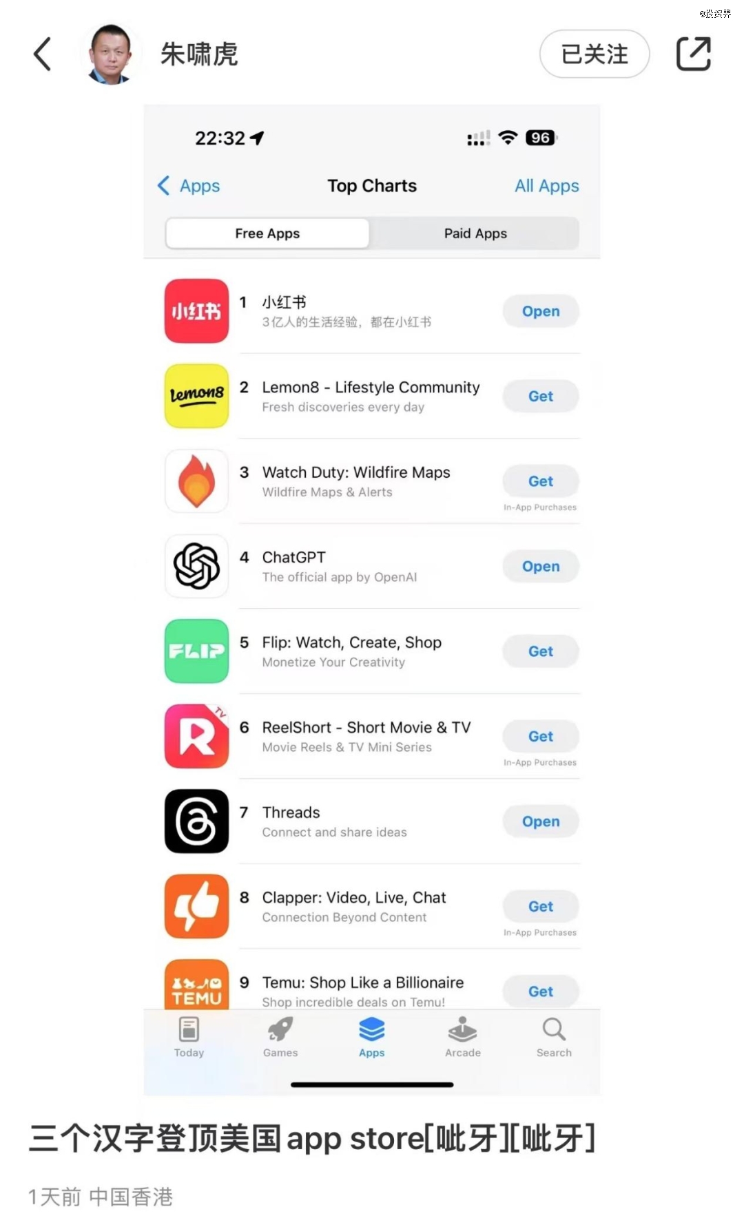 目睹這一幕,小紅書投資人朱嘯虎在個人小紅書帳號上發(fā)文:“三個漢字登頂美國app store”,并附以“呲牙笑”的emoji。喜悅之情溢于言表。