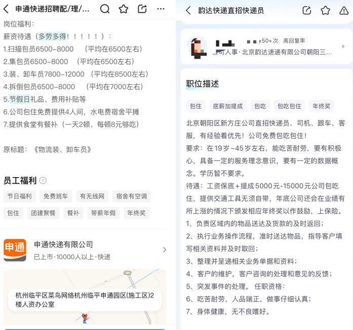 而BOSS、智聯(lián)等招聘平臺(tái)上,申通快遞員的招聘信息和商家對(duì)五險(xiǎn)一金的繳納也不統(tǒng)一。比如BOSS招聘平臺(tái)上,“申通快遞有限公司”只強(qiáng)調(diào)了薪資待遇多勞多得,有節(jié)假日補(bǔ)貼,但未明確社保繳納情況,北京鵬起申通貨運(yùn)代理有限公司則明確提供完善的社保;智聯(lián)招聘上,韻達(dá)、順豐等招聘信息則明確表示繳納社保。