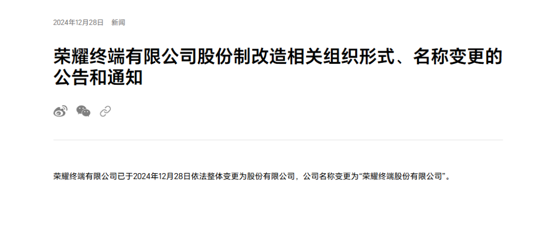 其一就是去年12月28日,榮耀發(fā)布公告,宣布股改已完成,榮耀終端有限公司已于2024年12月28日依法整體變更為股份有限公司,公司名稱變更為“榮耀終端股份有限公司”。