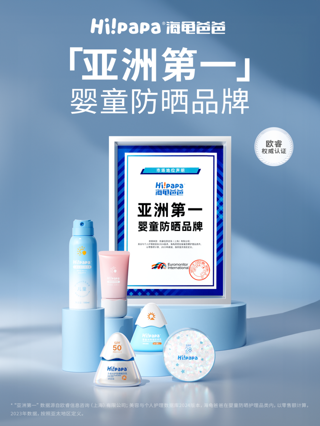 2024年底,國(guó)際權(quán)威數(shù)據(jù)公司歐睿信息咨詢發(fā)布的最新數(shù)據(jù)顯示,2023年海龜爸爸亞洲零售額體量達(dá)到1.09億美元,位居亞洲嬰童防曬市場(chǎng)第一,海龜爸爸也被歐睿認(rèn)證為“亞洲第一嬰童防曬品牌”。