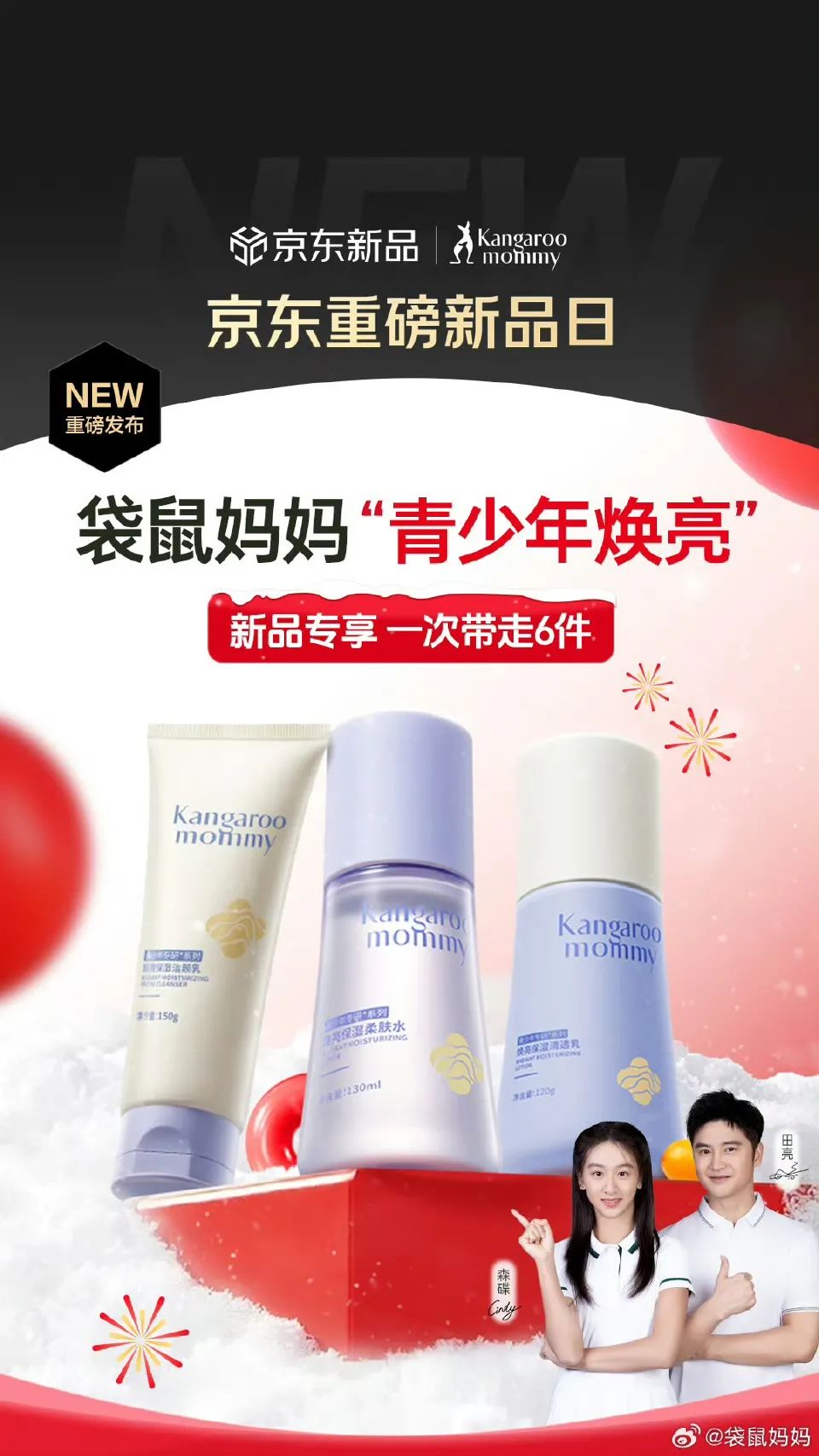 今年,袋鼠媽媽在青少年用品上持續(xù)發(fā)力,1月16日,上新專為12歲+青少年研制的新品袋鼠媽媽青少年煥亮保濕系列,由田亮與其女兒森碟傾情推薦。