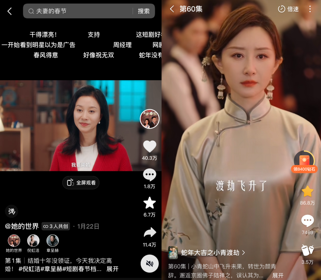 元素創(chuàng)新方面,去年《我在八零年代當(dāng)后媽》是憑借后媽噱頭+喜劇穿越+年代愛情的類型融新成功打出圈,今年就很缺這種頂級(jí)噱頭之作。比較熱的《老千》上演了一出千術(shù)高手&賭博天才與警方周旋的群像智斗、《夫妻的春節(jié)》開場就是女主當(dāng)全家人面平靜喊出“我要離婚”、《蛇年大吉之小青渡劫》蹭蛇年流量爆改青蛇前世今生的情劫虐戀,看得出這些項(xiàng)目整活整得很努力,但整體品質(zhì)還是差強(qiáng)人意。