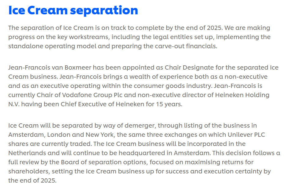 聯(lián)合利華2月13日宣布,有望年內(nèi)完成冰淇淋業(yè)務(wù)分拆,在關(guān)鍵流程方面取得進展,包括設(shè)立法人實體、實施獨立運營模式和準備分拆財務(wù)報表。
