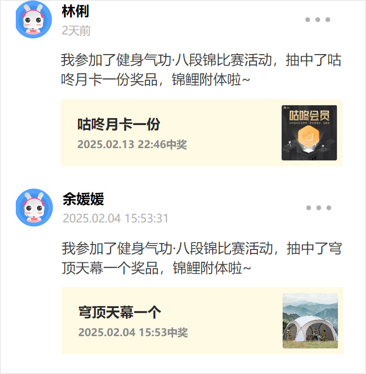 為了讓本次運(yùn)動(dòng)會(huì)更加生動(dòng)有趣,咕咚精心準(zhǔn)備了豐富的抽獎(jiǎng)環(huán)節(jié),獎(jiǎng)品涵蓋時(shí)下熱門的穹頂天幕、科技賦能的智能健身鏡、咕咚會(huì)員月卡等豪華大禮,旨在獎(jiǎng)勵(lì)每一位積極參與、勇于挑戰(zhàn)自我的健身愛(ài)好者。隨著抽獎(jiǎng)結(jié)果的揭曉,幸運(yùn)兒們紛紛曬出自己的中獎(jiǎng)截圖!