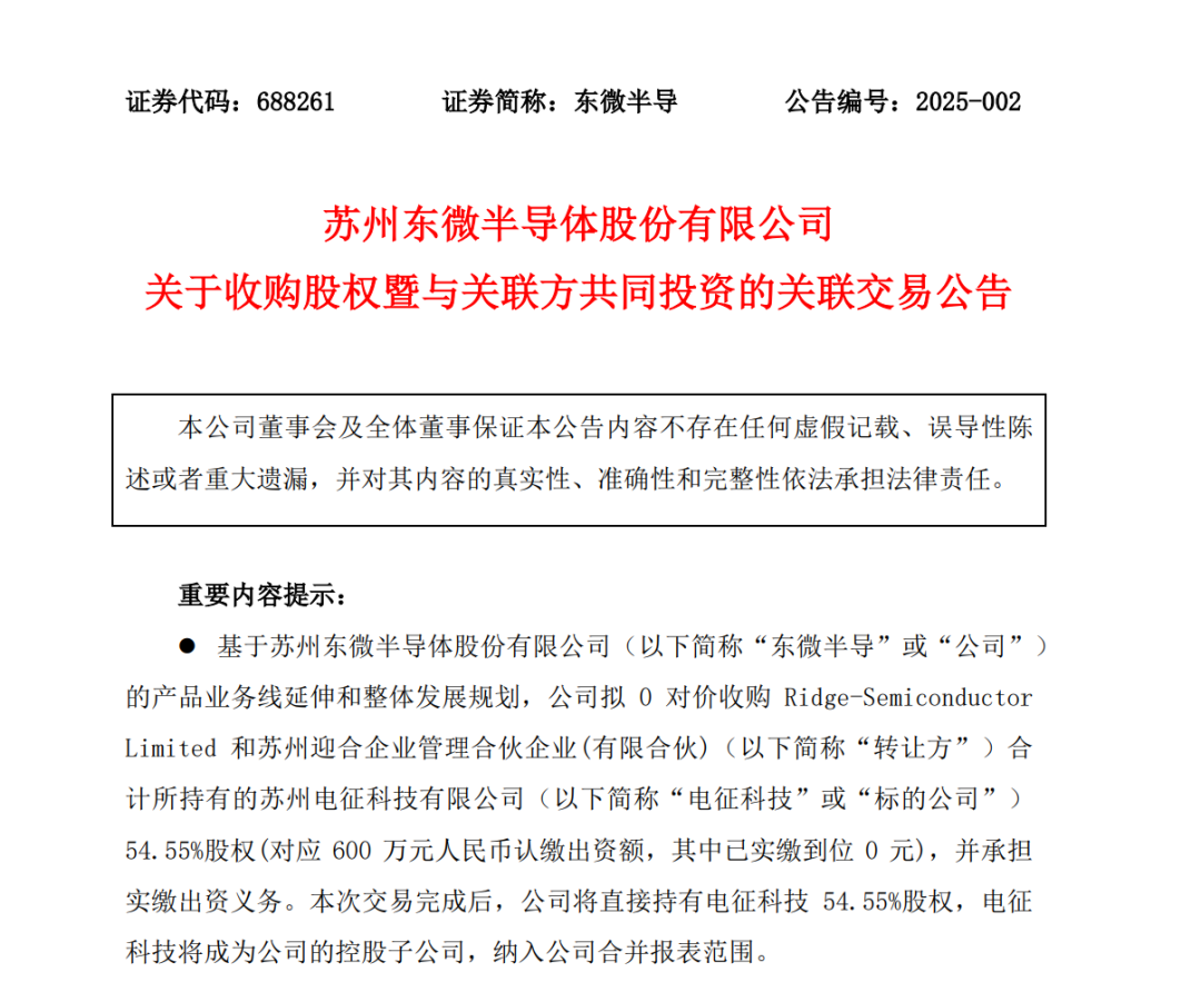 一個多月前,東微半導宣布了一起收購,交易對價是0元,頗受市場關(guān)注。