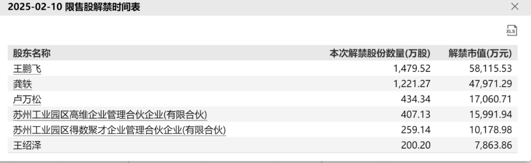 其余解禁股份為蘇州工業(yè)園區(qū)得數(shù)聚才企業(yè)管理合伙企業(yè)(有限合伙)、蘇州工業(yè)園區(qū)高維企業(yè)管理合伙企業(yè)(有限合伙)持有,共計666.27萬股,占該公司總股本的比例為5.44%。
