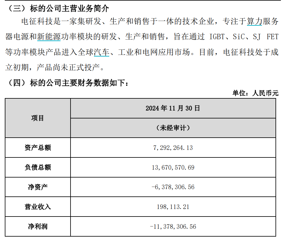 財務情況方面,電征科技凈資產(chǎn)為-637.83萬元,截至2024年11月30日的營收為19.81萬元,凈利潤為-1137.83萬元。