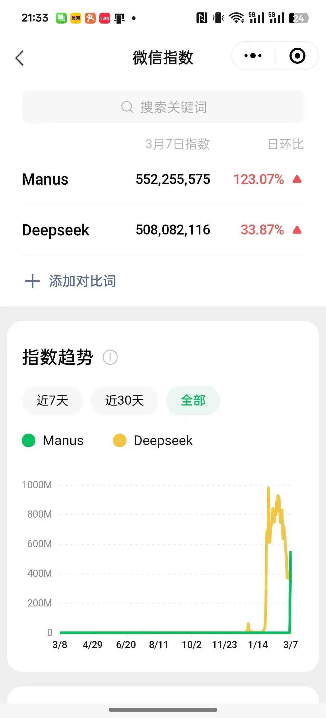 微信搜索指數(shù)對(duì)比:Manus未超越巔峰期的Deepseek