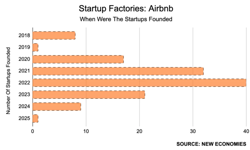 據(jù)第三方新聞資訊平臺New Economies最新數(shù)據(jù),這個由"Airbnb校友"構(gòu)建的生態(tài)體系,正在以每年新增35家初創(chuàng)企業(yè)的速度擴張——其中35%的房地產(chǎn)科技公司正在將Airbnb的共享邏輯轉(zhuǎn)化為垂直場景解決方案。