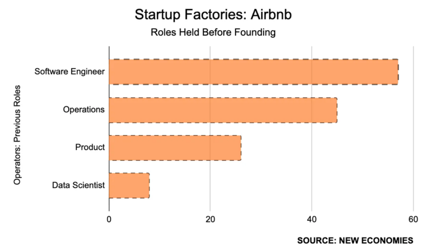 大部分創(chuàng)業(yè)者此前在Airbnb擔(dān)任軟件工程師:從我們分析的 140 多份創(chuàng)始人資料來看,典型的創(chuàng)始人在創(chuàng)辦企業(yè)之前都有軟件工程背景。其他常見的先前角色包括運營(包括營銷、增長和日常管理),其次是產(chǎn)品和數(shù)據(jù)科學(xué)。