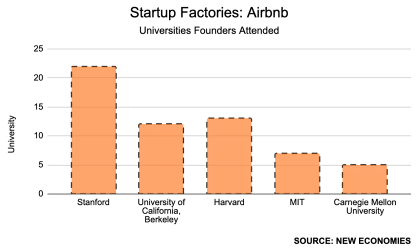人才鍛造體系:斯坦福大學(xué)以32%的創(chuàng)始人占比穩(wěn)居人才庫榜首,UC 伯克利、MIT、哈佛、卡耐基梅隆等頂尖院校構(gòu)成第二梯隊,這種學(xué)術(shù)基因與Airbnb內(nèi)部"設(shè)計思維"訓(xùn)練體系形成共振。