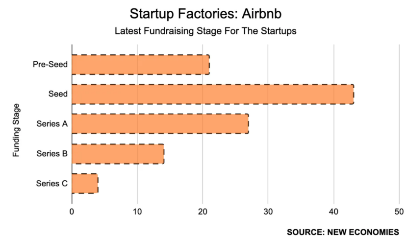 初創(chuàng)企業(yè)潛力強大:在Airbnb那些籌集了至少 50 萬美元并被列入本期名單的企業(yè)中,許多企業(yè)已經(jīng)從種子前期進入種子輪和 A 輪融資,一些企業(yè)逐漸進入 B 輪、C 輪融資,甚至一些企業(yè)已經(jīng)退出。