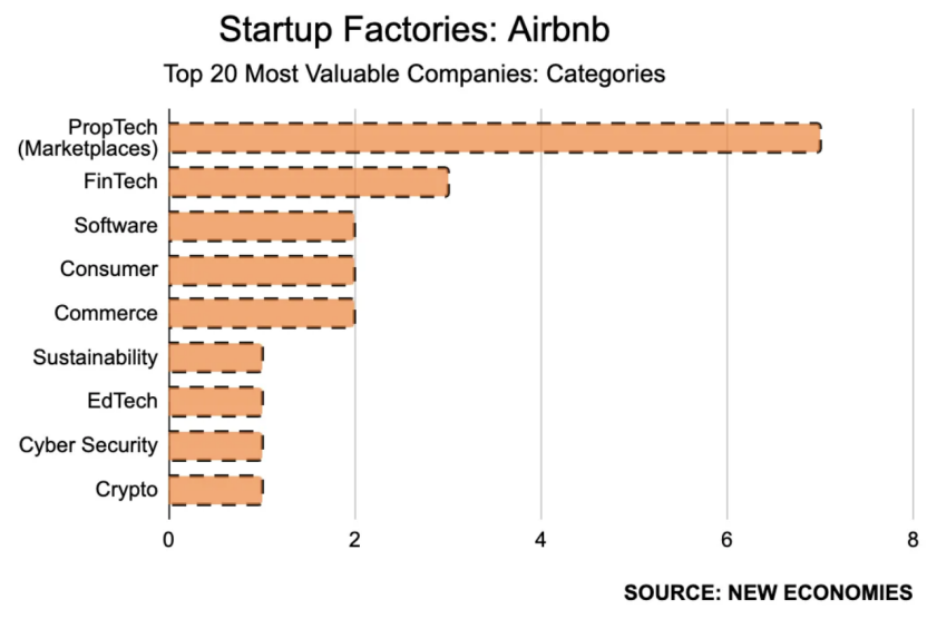 在Airbnb走出的,融資額排名前20的公司中,35%的公司正在建立與Airbnb相似的商業(yè)模式——房地產(chǎn)技術(shù),與此同時,還有金融科技、軟件、消費者、教育科技、網(wǎng)絡(luò)安全、加密貨幣等。