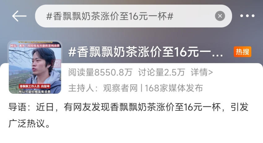 近日,有網(wǎng)友發(fā)現(xiàn)香飄飄新推出的“特級龍井輕乳茶”定價98元一箱,一箱6杯,算下來單杯售價16元多,相比香飄飄以往產(chǎn)品,價格漲了近5倍,可直接對標(biāo)中高端現(xiàn)制奶茶。頓時“香飄飄漲價”登上熱搜,并引起眾多網(wǎng)友熱議。