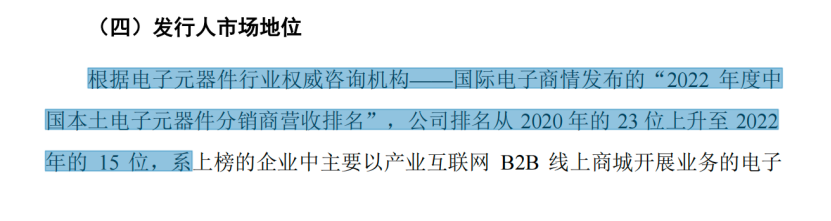 深耕行業(yè)多年之后,云漢芯城在市場中已經(jīng)占有一定地位。招股書顯示,根據(jù)電子元器件行業(yè)權(quán)威咨詢機構(gòu)——國際電子商情發(fā)布的“2022年度中國本土電子元器件分銷商營收排名”,公司從2020年的23位上升至2022年的15位。