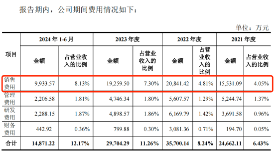 報告期內(nèi),公司的銷售費用分別為1.55億元、2.08億元、1.93億元和9933.57萬元,占當期營業(yè)收入的比例分別為4.05%、4.81%、7.30%和8.13%,銷售費用率逐年增長。