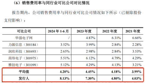 報告期內(nèi),云漢芯城的同行可比公司銷售費用率平均值分別為3.99%、4.18%、4.45%和4.20%,均低于云漢芯城的銷售費用率。