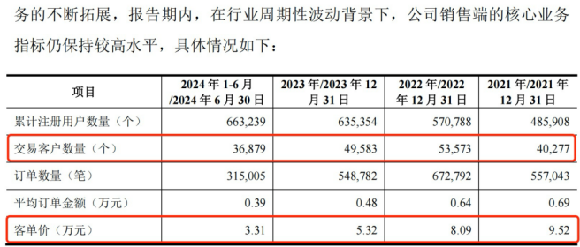 報告期內(nèi),云漢芯城的累計注冊用戶數(shù)量分別為48.59萬個、57.08萬個、63.54萬個和66.32萬個。在這期間,交易客戶數(shù)量卻只有4.03萬個、5.36萬個、4.96萬個和3.69萬個,其中2023年的交易客戶數(shù)量下降。