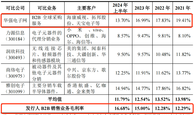 值得注意的是,云漢芯城的毛利率水平并不高。報告期內(nèi),公司的B2B銷售業(yè)務毛利率分別為12.29%、12.28%、15.00%和16.68%,同樣致力于線上分銷的華強電子網(wǎng)的銷售毛利率為19.41%、17.83%、16.99%和13.70%。
