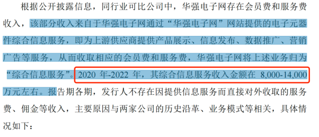 不過,華強電子網(wǎng)還有另外的盈利板塊,那就是收取會員費和服務費,這些收入來自電子元器件綜合信息服務,即為上游供應商提供產(chǎn)品展示、信息發(fā)布、數(shù)據(jù)推廣、營銷廣告等服務,從而收取相應的會員費和服務費。2020年至2022年,其綜合信息服務收入金額在8000萬元至1.4億元左右。