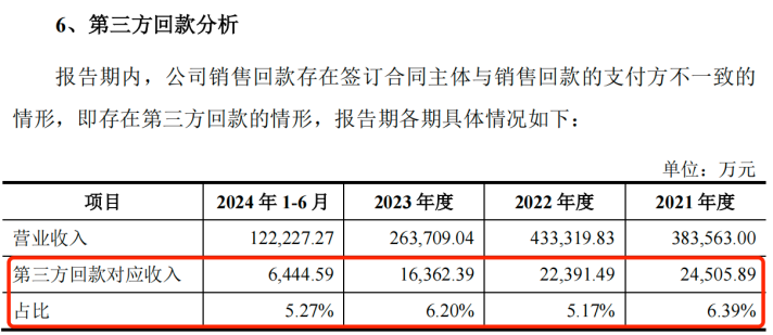 不僅如此,云漢芯城還存在第三方回款的情形。報告期內(nèi),公司第三方匯款金額分別為2.45億元、2.24億元、1.64億元和6444.59萬元,占當期營業(yè)收入比重分別為6.39%、5.17%、6.20%和5.27%。