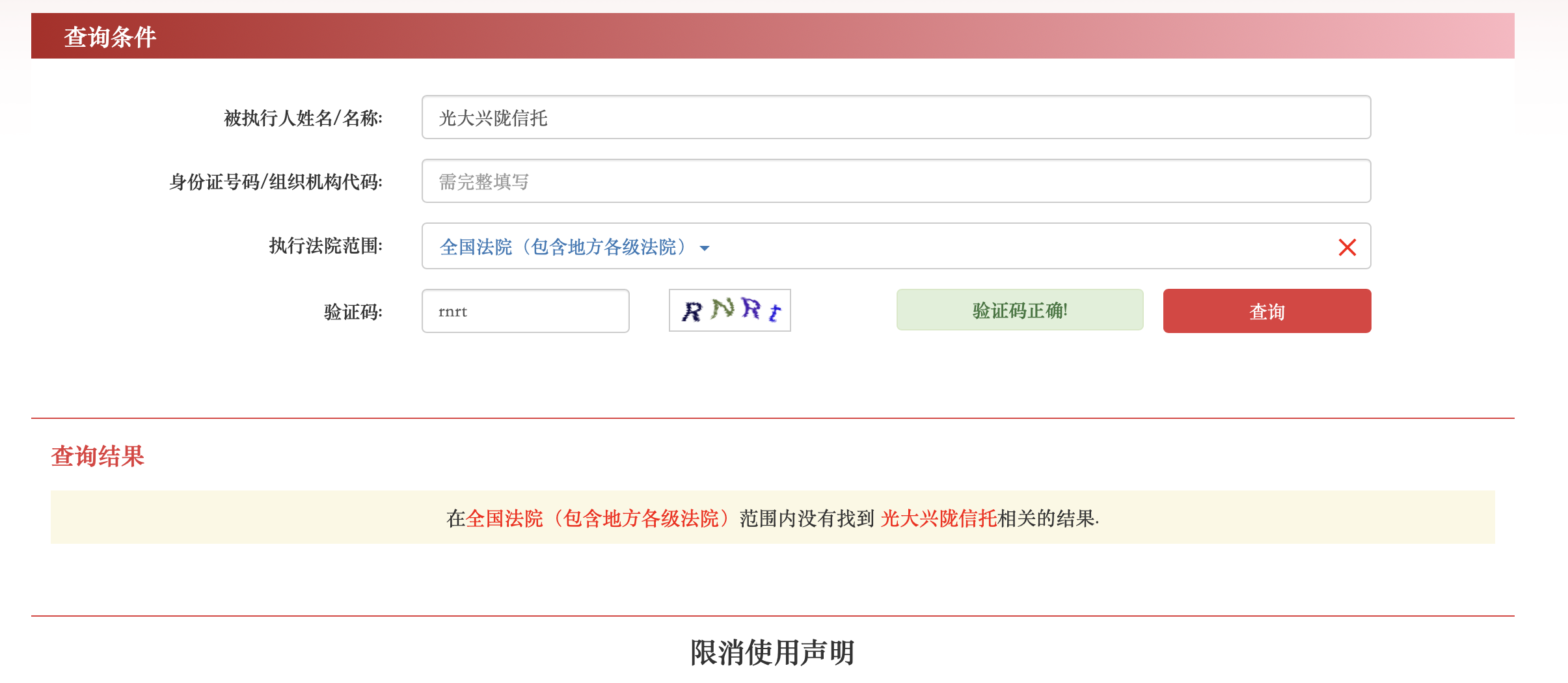 近日,天眼查APP法律訴訟信息顯示,光大信托及及其法人代表新增一則限制消費(fèi)令,案號(hào)為(2025)京0105執(zhí)3043號(hào),由北京市朝陽(yáng)區(qū)人民法院發(fā)出,發(fā)布日期為3月28日,執(zhí)行標(biāo)的為954573元。