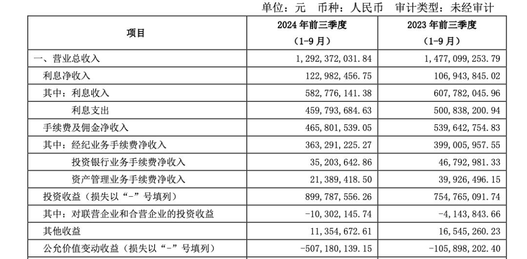 其中,中泰證券第三季度實現營業(yè)收入9370.15萬元,同比下降78.28%,歸母凈利潤虧損3809.55萬元,主要是受到第三季度自營業(yè)務的影響,投資收益和公允價值變動收益減少。