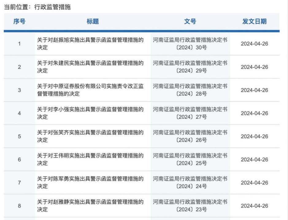 在對上述業(yè)務違規(guī)進行監(jiān)管的同時,中原證券7名業(yè)務負責人、高層領導也受到了河南證監(jiān)局的處罰。