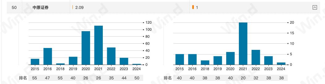 Wind數據顯示,2024年,中原證券保薦企業(yè)8家,已撤回7單,撤否率87.5%;2024年完成1單股權承銷項目,較2023年減少3家;承銷金額2.09億元,同比下滑89.2%,在58家券商中排第50位。