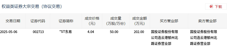 5月6日,*ST東易大宗交易成交50萬(wàn)股,成交額202萬(wàn)元,占當(dāng)日總成交額的20.73%,成交價(jià)4.04元,較市場(chǎng)收盤(pán)價(jià)4.46元折價(jià)9.42%。