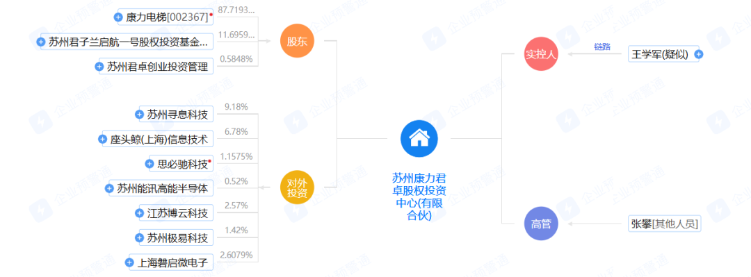 此外,康力電梯曾于2018 年4 月與朱美娟持股的蘇州君子蘭共同對(duì)外投資,發(fā)起設(shè)立蘇州康力君卓股權(quán)投資中心(有限合伙),目前該公司共對(duì)外投資7家公司,包括蘇州尋息科技、座頭鯨(上海)信息技術(shù)等科技、電子公司。