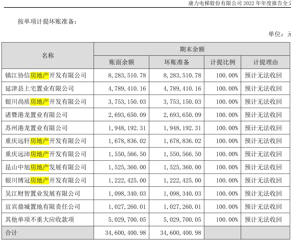 康力電梯2022年應(yīng)收賬款中,按單項(xiàng)計(jì)提壞賬準(zhǔn)備的金額合計(jì)約3460.04萬(wàn)元,其中大部分為房地產(chǎn)開(kāi)發(fā)公司,到了2023年,該項(xiàng)壞賬準(zhǔn)備金額大幅增加到2.03億元。截至2024年末,則進(jìn)一步增加至2.14億元。