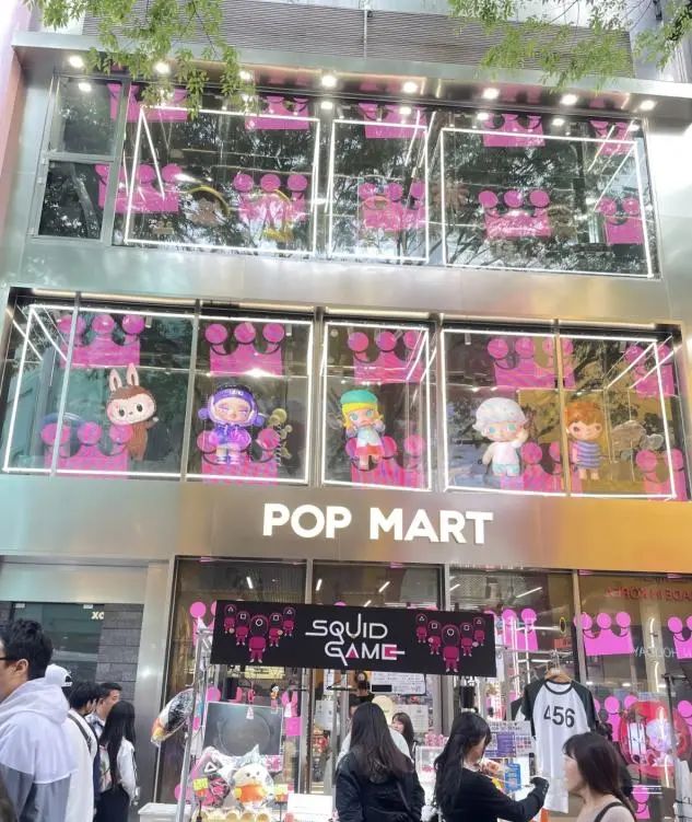 去年7月,韓國潮流地標明洞商圈開設(shè)的泡泡瑪特新店不僅包下三棟樓層,面積達到400平左右,更是設(shè)計為K-POP主題,打造了MEGA舞臺和K-POP mv拍攝區(qū),并在店鋪內(nèi)強化設(shè)計了拍照打卡空間,提升韓國粉絲的分享熱情,這顯然是與韓國潮流文化的一次深度融合。