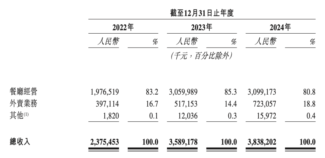 按收入類型來看,綠茶集團(tuán)2024年的餐廳經(jīng)營(yíng)收入約為30.99億元,較2023年的30.60億元微增1.3%。相比之下,綠茶集團(tuán)的外賣業(yè)務(wù)收入則保持了強(qiáng)勁的增長(zhǎng)態(tài)勢(shì)。其中,2024年的外賣業(yè)務(wù)收入約為7.23億元,同比增長(zhǎng)39.8%,占比為18.8%。