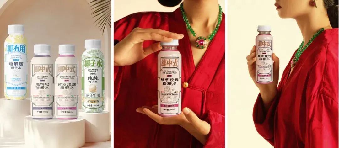 主打“東方鮮椰”的蔻蔻椰先是以爆品鮮萃粉椰水拉開了差異化的序幕,后又于今年連續(xù)推出“椰中式”和“椰有用”兩個(gè)產(chǎn)品矩陣,前者將玫瑰、黑枸杞、桑葚等滋補(bǔ)天然食材復(fù)配打出“中式養(yǎng)生”概念,后者則以“NFC椰子水+NFC檸檬汁”的雙NFC配方主攻電解質(zhì)功能飲生態(tài)位,將差異化進(jìn)行到底。