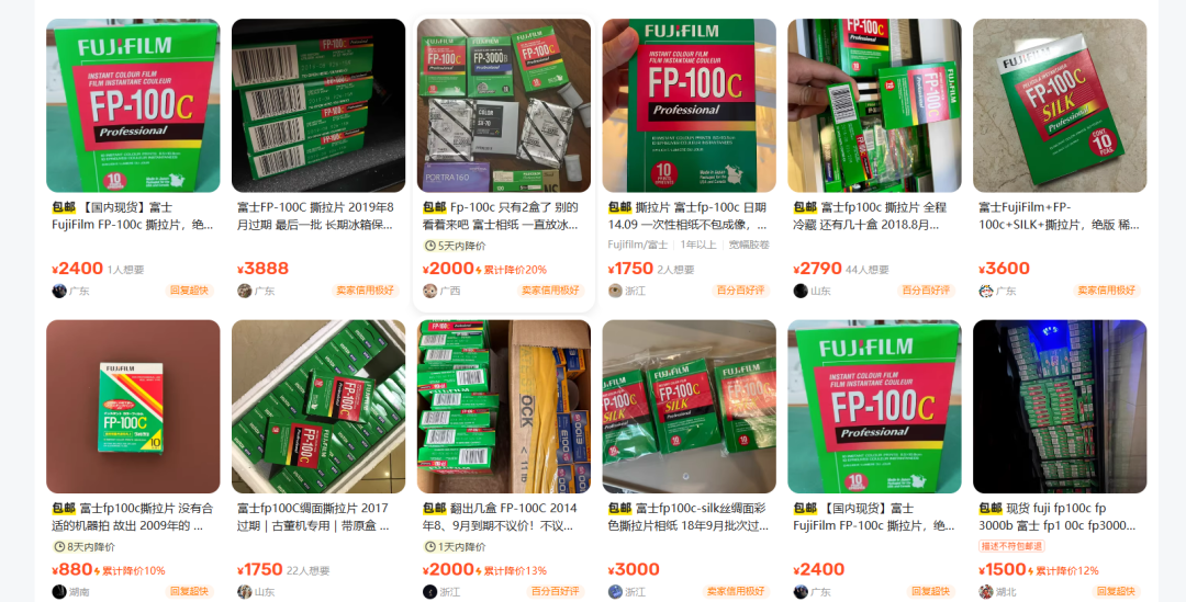 即便如此,年輕人的熱情依舊高漲,這一點從二手市場就能窺見一角。富士FP-100C停產(chǎn)多年,存貨價格像坐了火箭,根據(jù)生產(chǎn)日期、批次差異,閑魚上一盒未拆封的富士FP-100C普遍標價在1500-4000元之間(停產(chǎn)前70元),折合單張最低150元,至少是相紙停產(chǎn)前售價的20倍,比茅臺還貴。