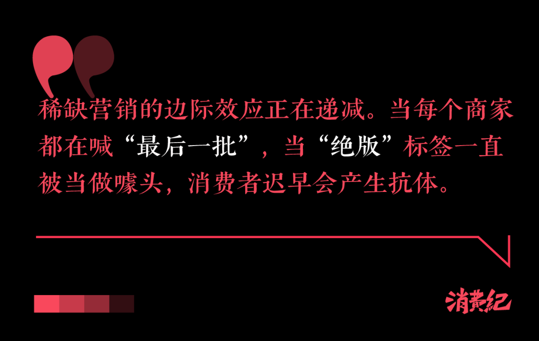 事實上,撕拉片的未來走向其實受多重因素牽制。首先,稀缺營銷的邊際效應正在遞減。當每個商家都在喊“最后一批”,當“絕版”標簽一直被當做噱頭,消費者遲早會產(chǎn)生抗體。就像游戲皮膚限定款頻繁搞返廠,最終讓“限定”變得“爛大街”。