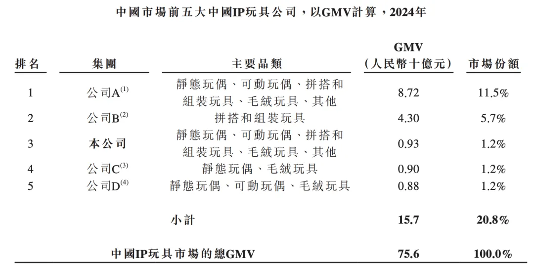 根據樂自天成招股書援引灼識咨詢的數據,按2024年的GMV計算,52TOYS是中國第三大IP玩具公司。不過,這個頭銜的含金量并不算高,因為對應到具體數值上,排在前兩位的公司,大概率是已經上市的泡泡瑪特和布魯可,而排名在第三至第五位的公司,其年度GMV相差不足0.1億元,且相應的市場份額都為1.2%。