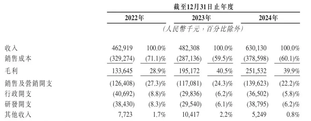 出現(xiàn)這樣的情況,一個重要原因在于,52TOYS的毛利率在同類公司中一直較低。根據招股書數據,2022年至2024年,52TOYS的毛利率分別為28.9%、40.5%和39.9%,雖然出現(xiàn)了一定程度的增長,但與同賽道的其他公司相比,仍然差距較大。比如在2024年,泡泡瑪特和布魯可的毛利率分別為66.8%和52.6%。