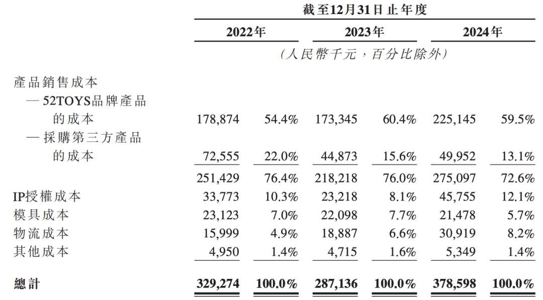 而較低的毛利率,取決于公司的商業(yè)收入結構。一方面,52TOYS的主要收入來自于授權IP,招股書數據顯示,2022年至2024年,公司來自授權IP的收入占比分別為50.2%、59.3%和64.5%,逐年遞增。其中,僅蠟筆小新相關產品在2022年至2024年的累計GMV就超過6億元,占三年總收入的近40%。而授權IP需要公司支付相應的IP授權成本,報告期內,52TOYS的IP授權費用累計達1.03億元。