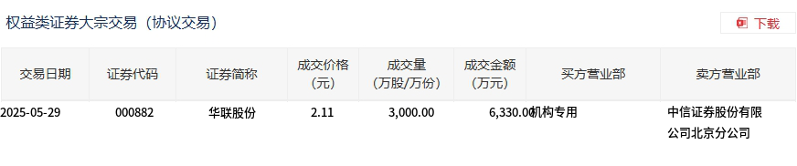 5月29日,華聯(lián)股份大宗交易成交3000萬股,成交額6330萬元,占當(dāng)日總成交額的26.37%,成交價(jià)2.11元,較市場(chǎng)收盤價(jià)2.17元折價(jià)2.76%。
